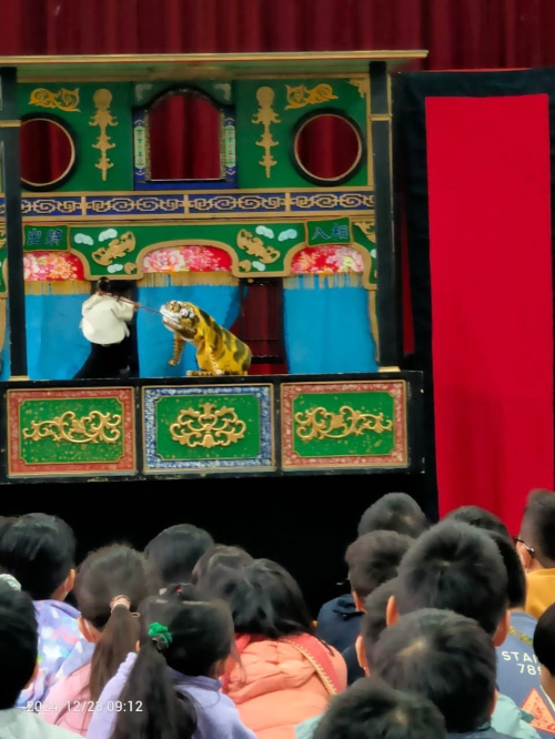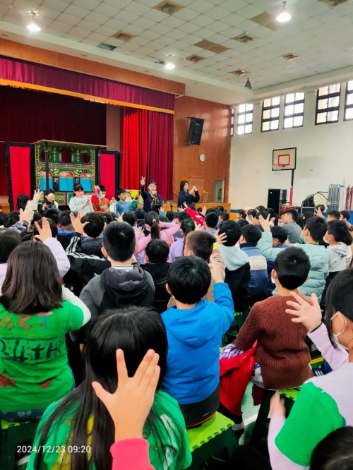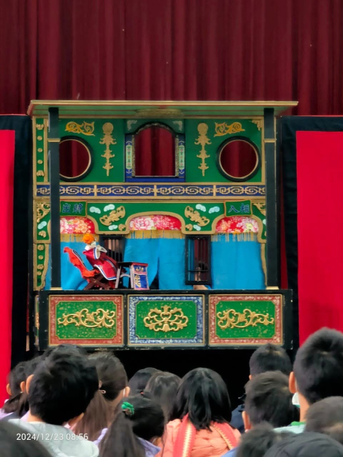 客家布袋戲劇團蒞校演出,學生們在笑聲與掌聲中感受活的文化與動人的故事。