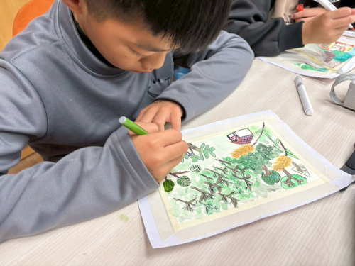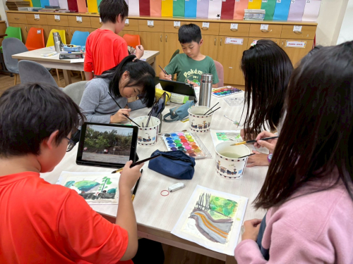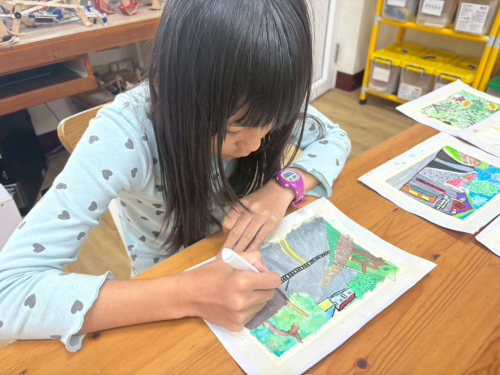 孩子們拍攝後的照片洗出後,將孩子們拍攝地社區的風景繪製成明信片及社區地圖,從選定場景到草圖,最終利用各式不同媒材,例如:水彩、丙烯筆、剪貼……等,創作出色彩鮮豔、童趣可愛,孩子眼中最喜歡的景山明信片及社區地圖。