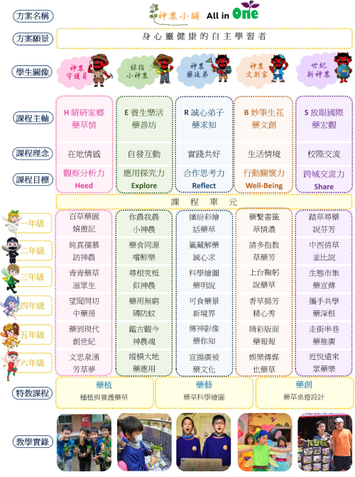 本校將藥草融入課程成為學校在地化特色的校訂課程,利用校園空間設置藥用植物園,與「神農大帝」地方信仰文化結合,彩繪地板與牆面,建置教學網頁,實施藥草課程、科普閱讀及生活美學,讓學生不僅學習到藥用植物知識,了解在地文化,更能創造生活中的美感。