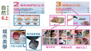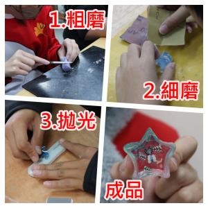 | 陽光、石滬、沙 | 石滬堆砌成型的概念運用在沙畫上,不同厚度的沙在光的照射下會有不同程度的透光 | 竹南科技中心-藍晒課程 | 六年級自然-變動的大地 組成石滬用的鵝卵石為河流下游及出海口常見的材料,漁民們就地取材用自然最不破壞自然的工法,向大自然討一點夠用就好的生存營養。 |