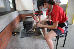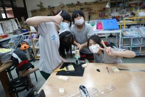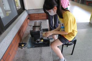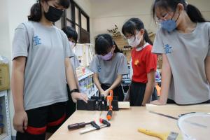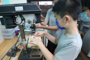 王老師帶孩子利用廢棄木材,從木塊開始發想,設計出自己的專屬小車,透過設計、切鋸、鑽孔、砂磨....等實作,進而認識木工器具。除了學習使用鋸子、弓形鋸等手工具之外,也學習線鋸機,鑽床等機器設備的操作,這個木作體驗的重點在於如何從無到有,透過木頭的特性,輪子轉動的原理,設計出一台獨一無二的玩具小車。