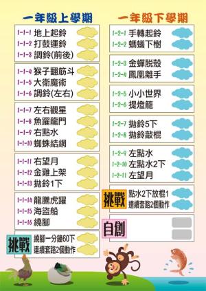 表演藝術元素 1.扯鈴夜光龍基礎動作教學 2.韻律體操彩帶動作教學 |