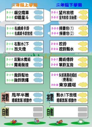 扯鈴表演藝術動作搭配 1. 長繩:長繩一鈴、長繩兩鈴、長繩兩鈴跳鈴、自創動作發表。 2. 花式團體融入單鈴、直立鈴、雙鈴、三鈴、長繩等動作:單人動作一致性,兩人小組搭配、四人小組搭配、六人小組搭配、八人團體搭配。 |