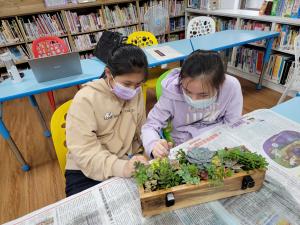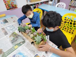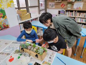 1. 運用設計思考的教學策略,以活化閒置空間為構想,從「在地產業連結」為出發點。低年級:從室內課程草莓繪本學習,延伸到戶外課程草莓園體驗,進而創作草莓童詩。中年級:多肉盆栽妝點新生命,多肉植物栽培、木板植栽牆。高年級:在地文化故事牆彩繪