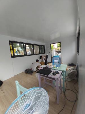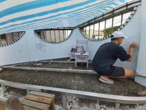 以多肉培養作為主軸延伸至圍牆,使用回收的木棧板製成模組化的盆栽牆面,最後搭配適度的插圖在木架上穿梭,增添空間中活潑的感覺